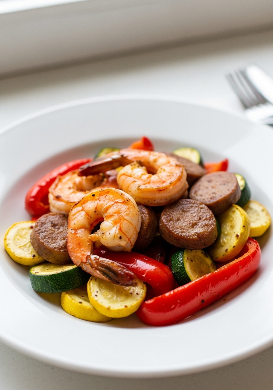 This quick and convenient Cajun Shrimp dish is a complete meal, featuring succulent shrimp, flavorful sausage, and a vibrant mix of vegetables like zucchini, yellow squash, and bell peppers.