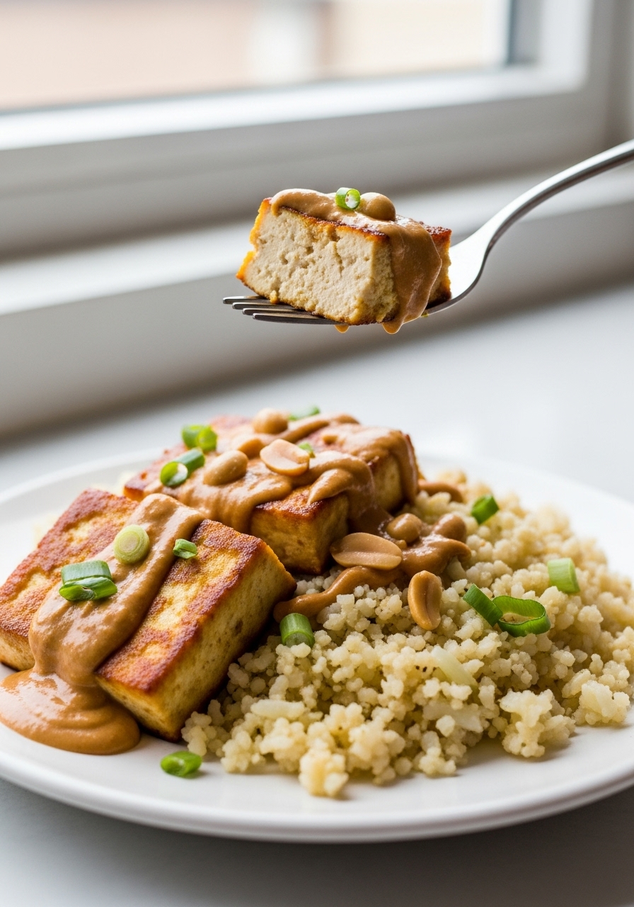 To serve: In 2 shallow bowls, layer each with ½ the cauliflower rice and half the tofu. Top each with scallion greens and peanuts.