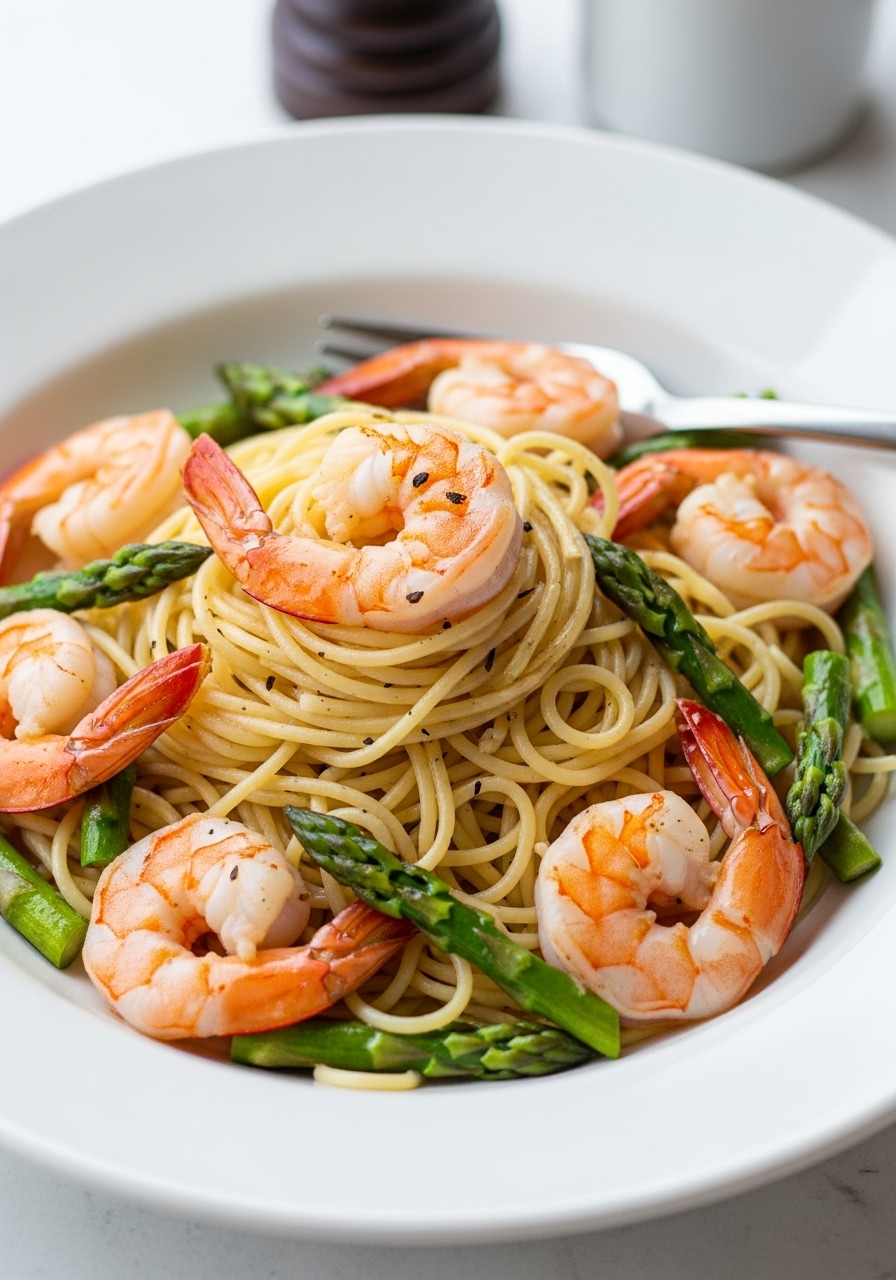 Indulge in a delightful bowl of Angel Hair with Shrimp and Asparagus, a simple yet flavorful pasta creation. This dish features tender shrimp and crisp asparagus, all brought together in a refreshing tomato broth enriched with fresh tomatoes. Perfect for a swift weeknight dinner or a charming gathering, this recipe combines ease with deliciousness.