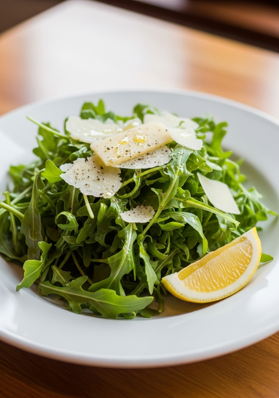 Place the arugula in a mixing bowl, then drizzle with 2 tablespoons of olive oil, squeeze in the juice of half a lemon, and sprinkle with 1/4 teaspoon of kosher salt and black pepper. Gently toss to combine all ingredients evenly.