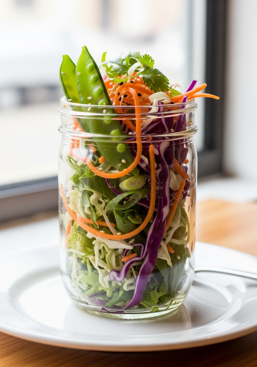 This vibrant salad, inspired by Asian flavors, features a delightful mix of edamame, bell peppers, carrots, snow peas, cabbage, and lettuce, all drizzled with a light sesame-soy dressing. Packed into one jar, it offers a generous portion that's ideal for a satisfying lunch or can easily serve two as a refreshing side dish.