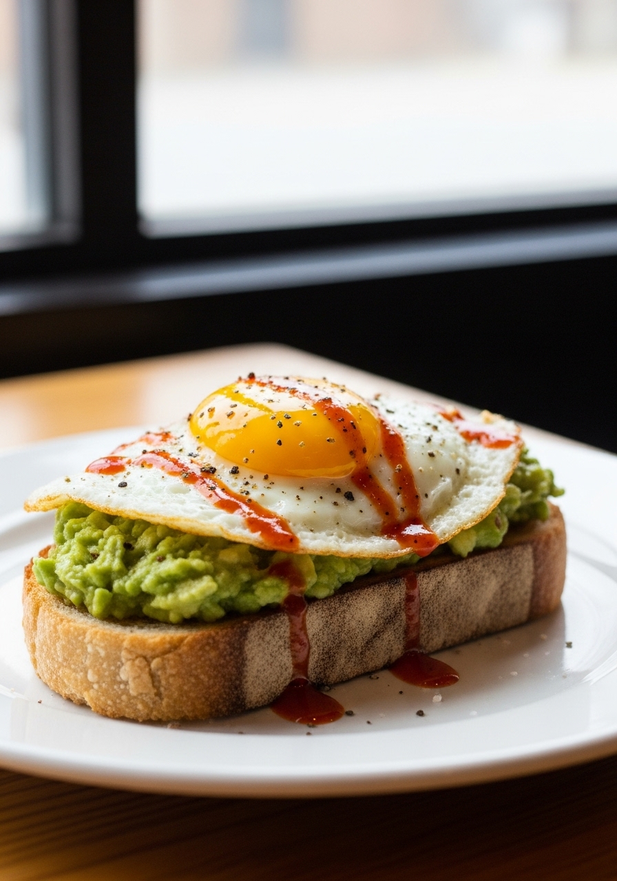 Spread the mashed avocado over a slice of toast, place the egg on top, and finish with a sprinkle of salt and pepper. Add hot sauce or red pepper flakes if you wish for an extra kick!