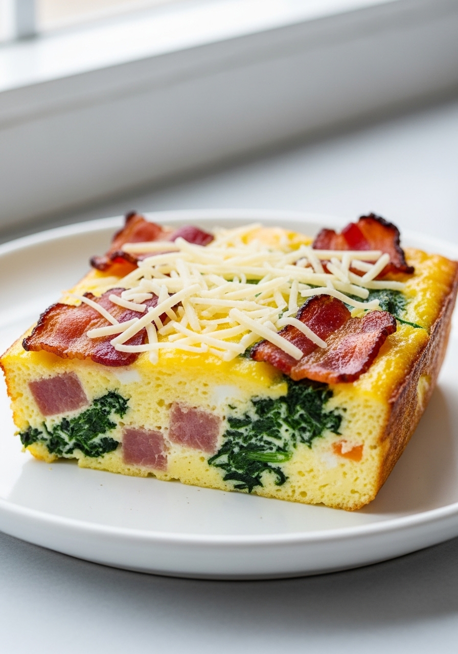 Reserve 1 cup of cheese for later, then mix the remaining cheese into the eggs. Add in the milk, salt, pepper, the cooked spinach mixture, and the bacon, stirring until everything is evenly blended.