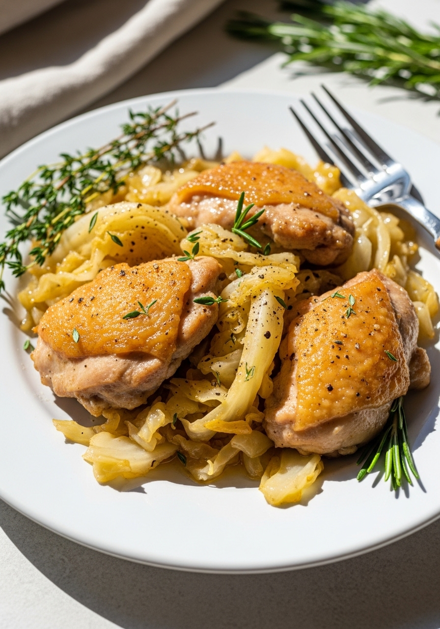 "Baked Apple Cider Chicken and Cabbage is an ideal one-pot meal for autumn, featuring chicken marinated in apple cider alongside vibrant red cabbage and sweet apples."