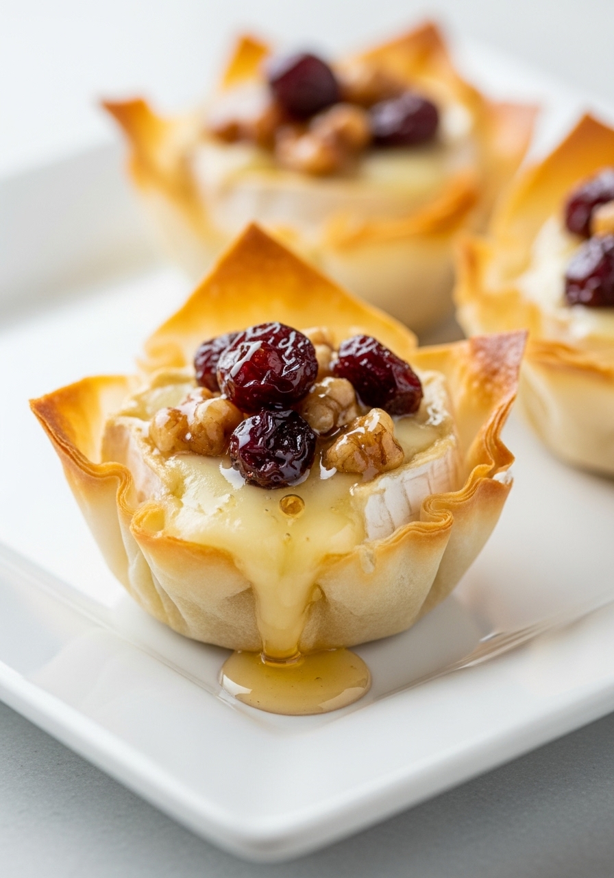 "These simple Baked Brie Phyllo Cups are made with just five ingredients and crowned with sweet craisins, crunchy walnuts, and a drizzle of honey. They make for a delightful, bite-sized treat that’s ideal for your festive gatherings!"