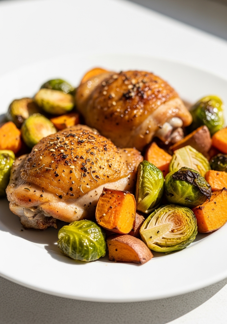 "Enjoy a cozy, one-pan meal with Baked Chicken Thighs accompanied by Brussels Sprouts and Sweet Potato, perfect for a crisp autumn evening. This simple and delicious dish comes together effortlessly, making it an ideal choice for a satisfying dinner."