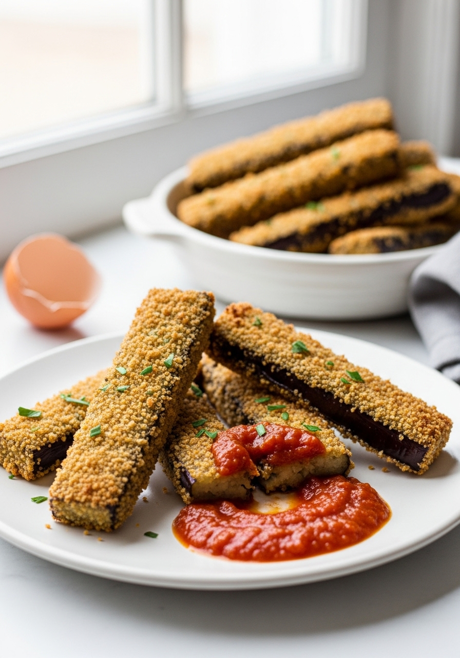 Introducing our Crispy Baked Eggplant Sticks, coated in savory Italian breadcrumbs and a sprinkle of Parmesan cheese. They are baked or air-fried to a delightful golden brown and paired perfectly with a speedy marinara sauce for dipping. Enjoy this deliciously crunchy treat!