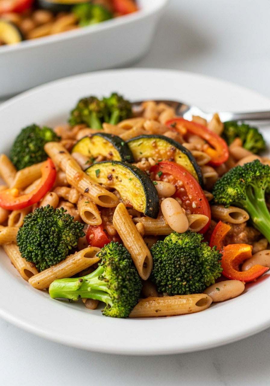 Indulging in this Balsamic Roasted Veggie and White Bean Pasta will have you craving it throughout the summer! Each mouthful is packed with a delightful medley of vegetables, all brought together with a luscious pesto and hearty white beans. Enjoy the flavors of roasted zucchini, yellow squash, cherry tomatoes, red onion, mushrooms, bell peppers, and broccoli – it's absolutely delicious and has even won over the most selective eaters!