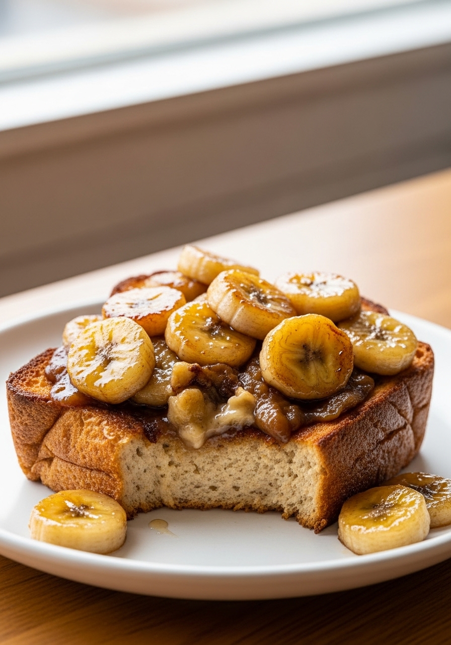 Keep the banana mixture covered until the French toast is ready. Once the French toast is cooked, serve it on 8 individual plates and generously top each serving with the banana mixture. Enjoy your delicious creation!