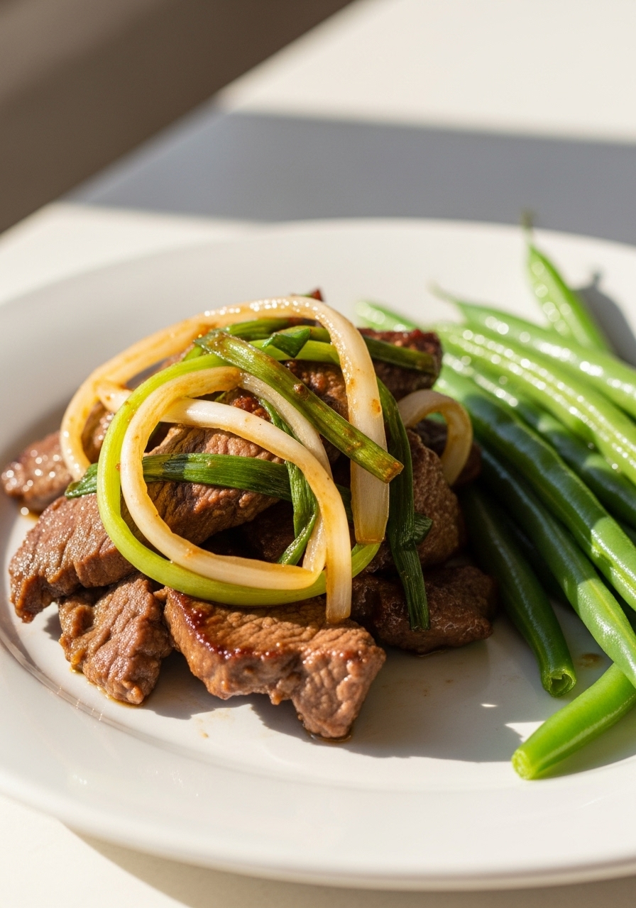 "Beef Negimaki Stir Fry takes the classic flavors of Japanese meat sushi and transforms them into a vibrant stir fry, pairing succulent beef with crisp green beans for a hearty and satisfying main course."