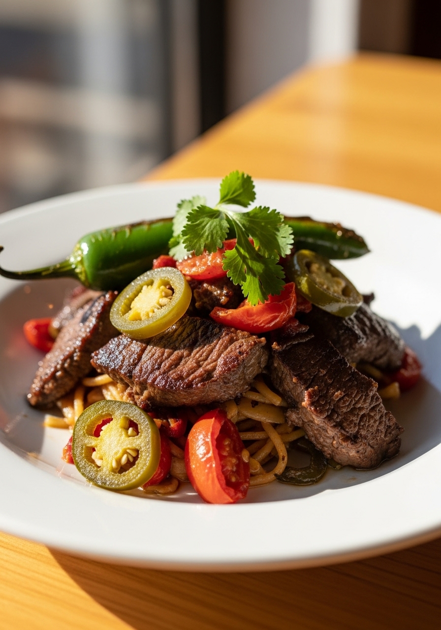 Bisteces a la Mexicana is a delicious beef stew inspired by traditional Mexican flavors. This hearty dish simmers gently, combining tender pieces of beef with ripe tomatoes, zesty jalapeños, onions, and a harmonious blend of Mexican herbs and spices to create a rich, comforting meal.