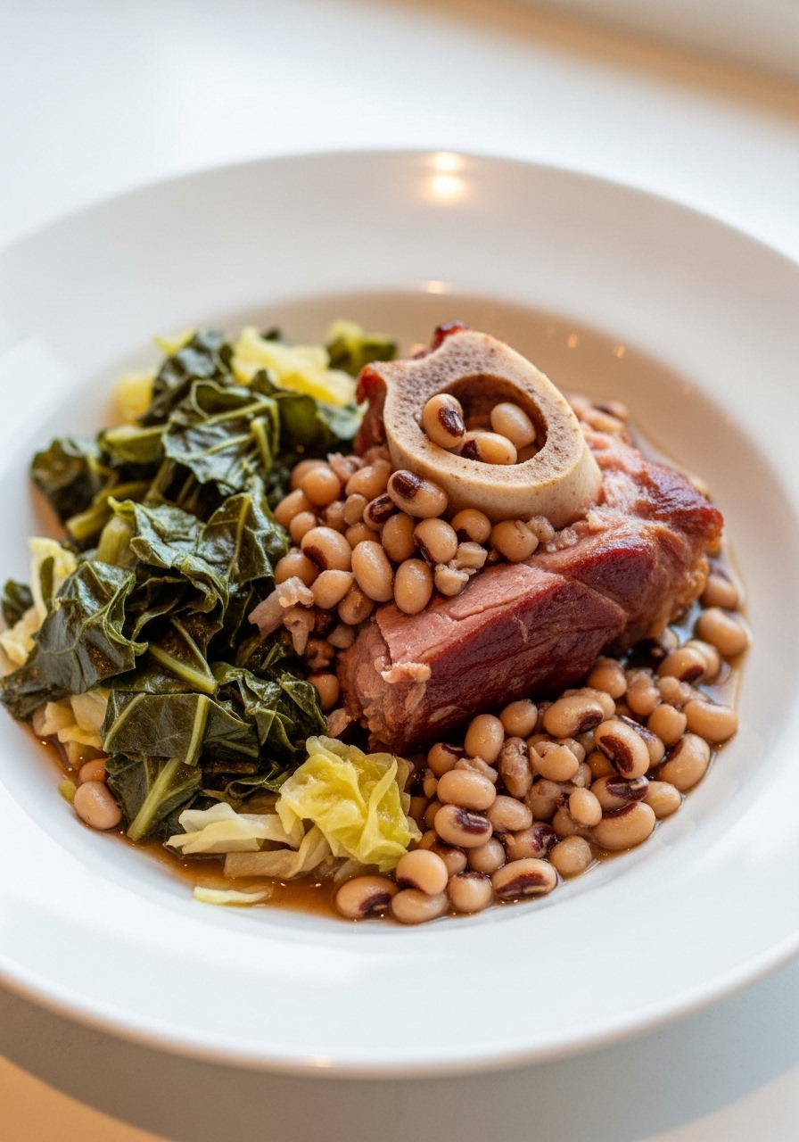 "Start the new year off right with a hearty stew featuring Black-Eyed Peas, leftover ham bone, collard greens, and cabbage! This comforting dish not only warms you up but also brings good fortune for the year ahead!"