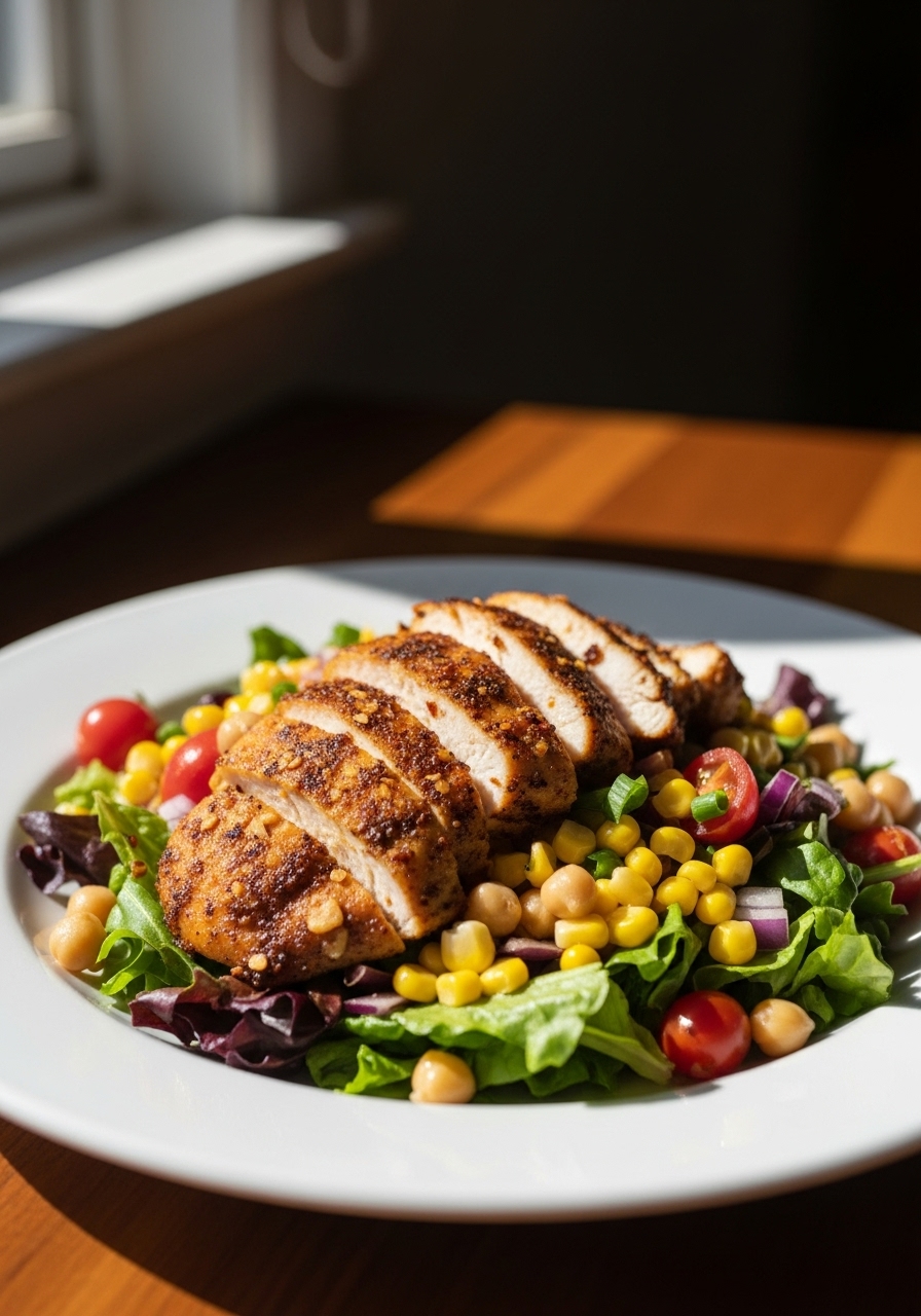 Savor the bold flavors of blackened chicken served atop a vibrant chickpea salad bursting with fresh corn, juicy tomatoes, creamy avocado, and a zesty splash of lime juice. This delightful meal is perfect for a hassle-free weeknight dinner!
