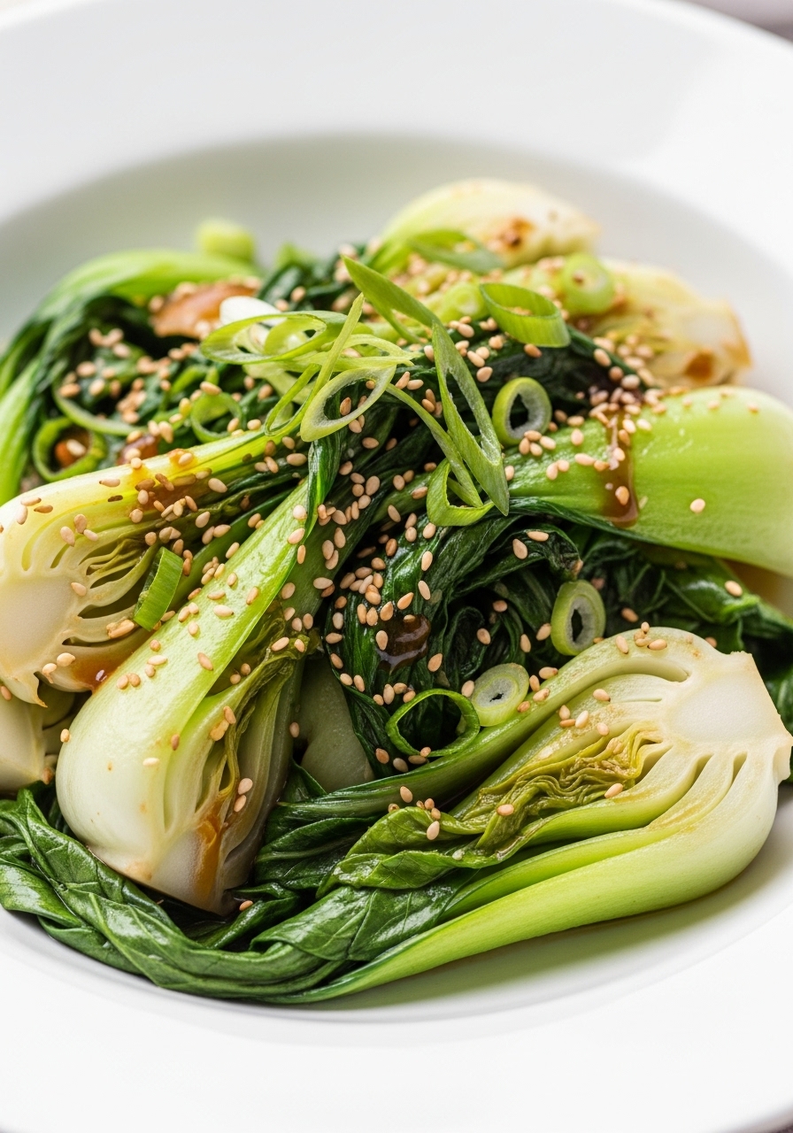 Flip the bok choy over and continue cooking for an additional 4 minutes, or until it’s nicely browned and caramelized. If desired, garnish with scallions and sesame seeds. Serve while hot.
