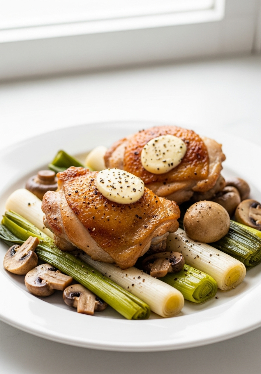 "Braised Chicken Thighs with Mushrooms and Leeks is an ideal dish to warm you up on chilly days, offering a delightful sense of comfort."