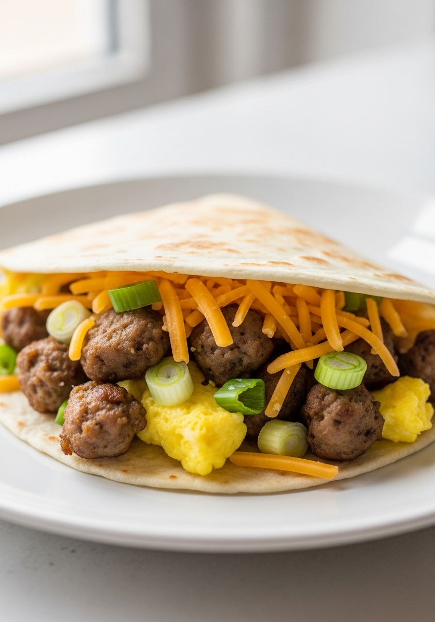On the lower half of the tortilla, scatter half of the cheese evenly. Layer the cooked eggs and sausage on top, followed by the remaining cheese. Cook until the bottom of the tortilla is golden brown and crispy, approximately 2 to 3 minutes. Carefully fold the tortilla in half and flip it over, cooking until the cheese inside has melted.