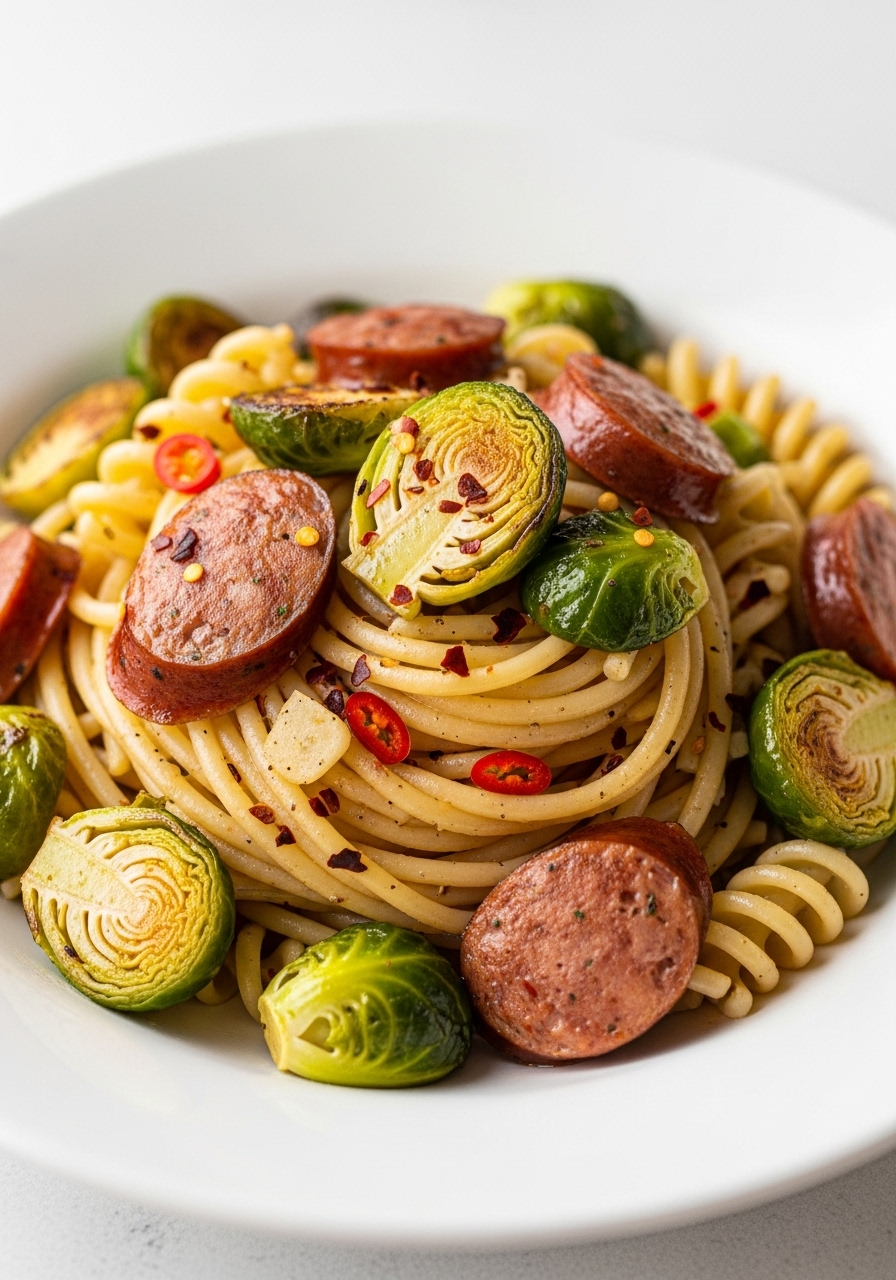 "Twisted parsnips serve as a delightful alternative to traditional pasta in this hearty and zesty fall recipe featuring brussels sprouts and flavorful spicy chicken sausage." Recipe title: "Brussels Sprouts and Sausage Parsnip Spiralized Pasta"