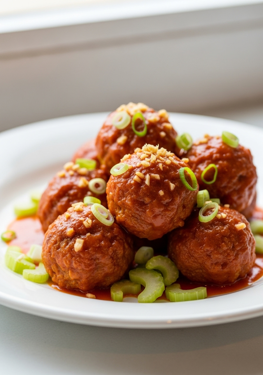 "An ideal dish for game day! These oven-baked chicken meatballs are packed with finely chopped celery and carrots, all drizzled with spicy hot sauce and accompanied by a creamy homemade blue cheese dressing – delicious!"