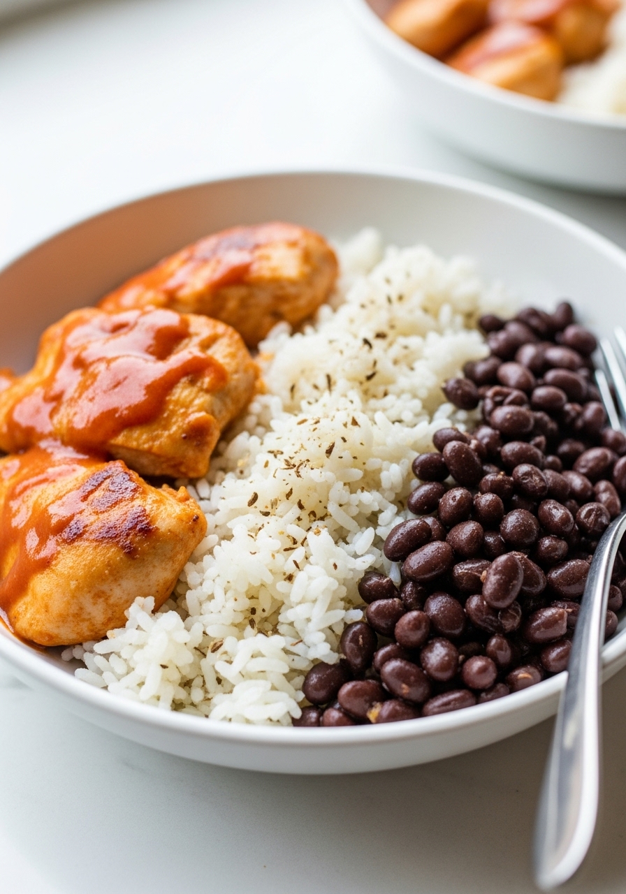 Savor the mouthwatering flavors of these protein-packed Buffalo Chicken Rice Bowls, featuring tender chicken breast, hearty black beans, wholesome brown rice, and a generous sprinkle of cheese, all drenched in zesty hot sauce. An ideal choice for meal prepping!
