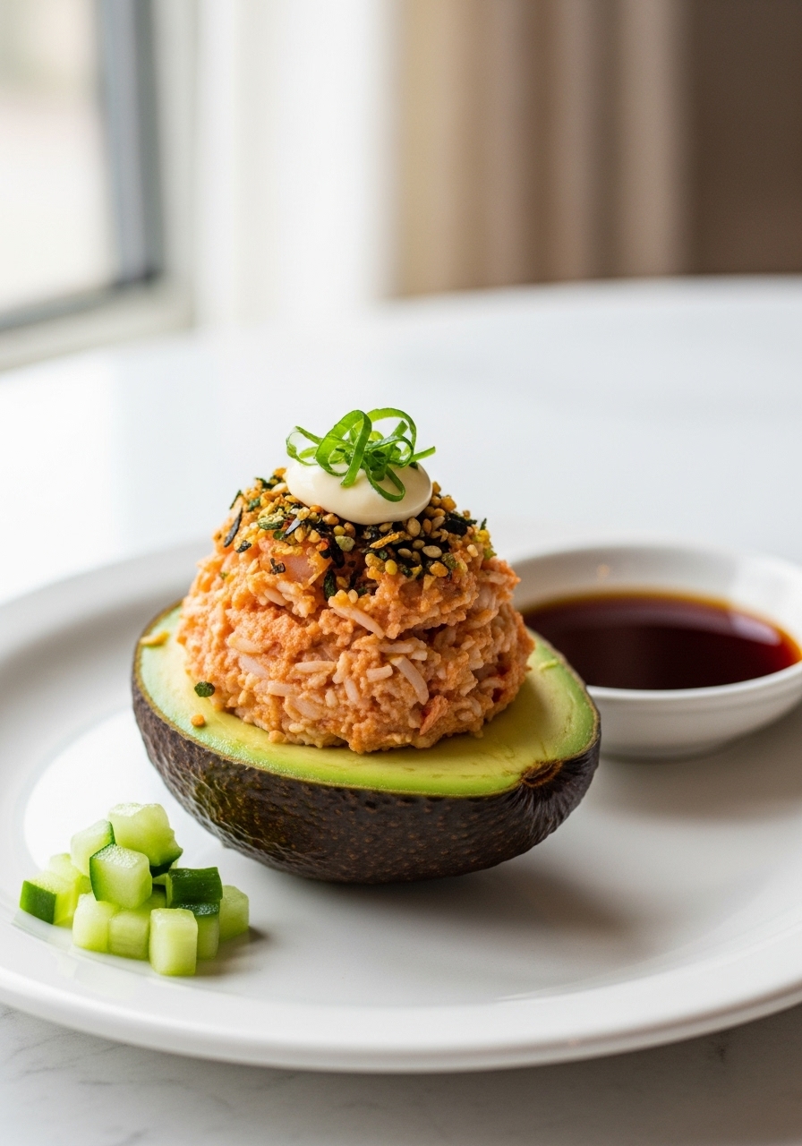 These avocados are filled with tender lump crab meat, crunchy cucumbers, and a zesty spicy mayo, all finished off with a sprinkle of furikake and a light drizzle of soy sauce. I’ve been thinking about this combination for days, and I’m thrilled with the result; they turned out absolutely delicious!