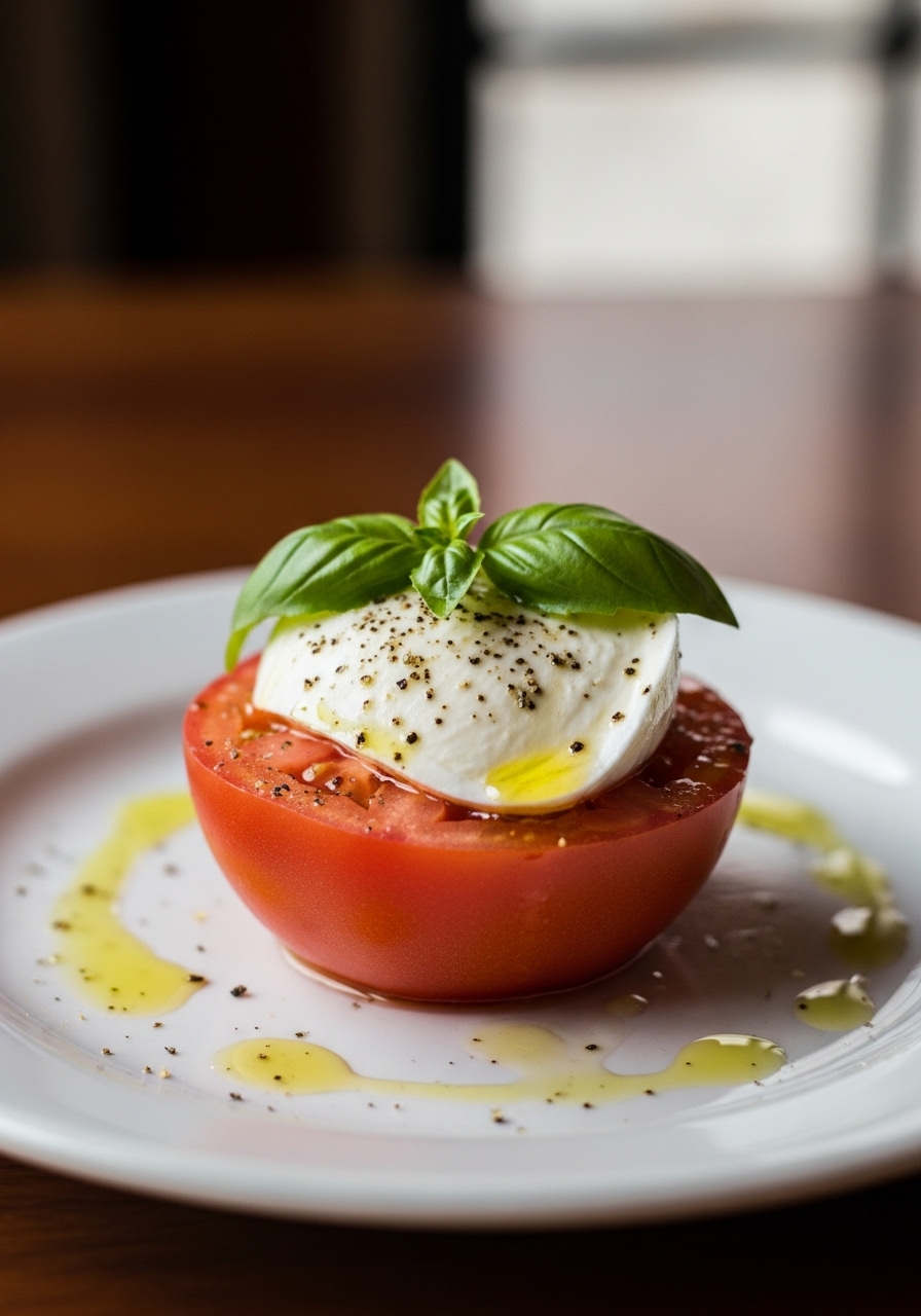 "Experience the essence of summer with a delightful Caprese salad, featuring creamy, fresh mozzarella paired with luscious, ripe tomato slices, fragrant basil, and a drizzle of balsamic vinegar. It's a breeze to prepare!"