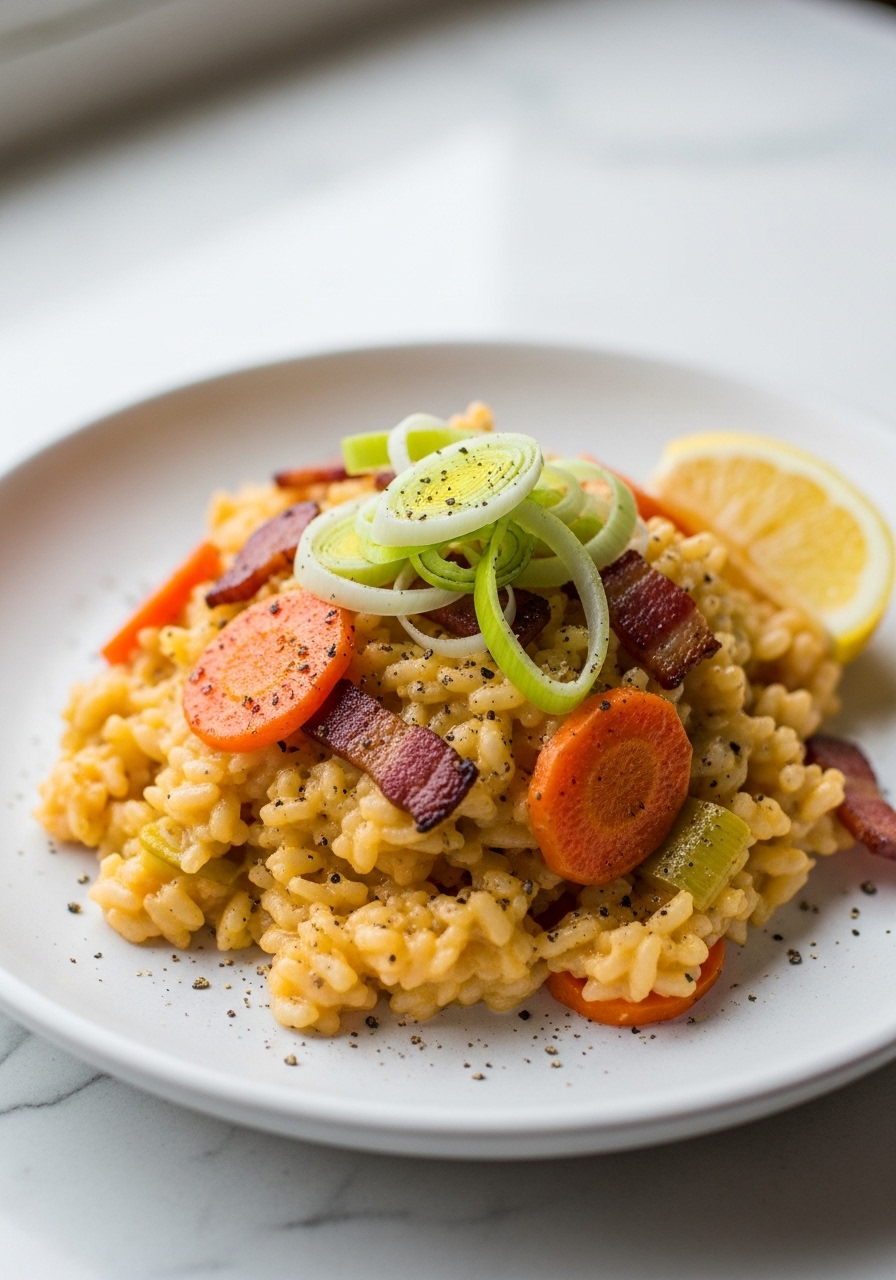 As you savor each bite of this light and airy spiralized carrot "rice" leek risotto topped with crispy bacon, you’ll be amazed that it’s not traditional rice. This dish comes together in no time and is perfect for those following gluten-free, paleo, and dairy-free diets.