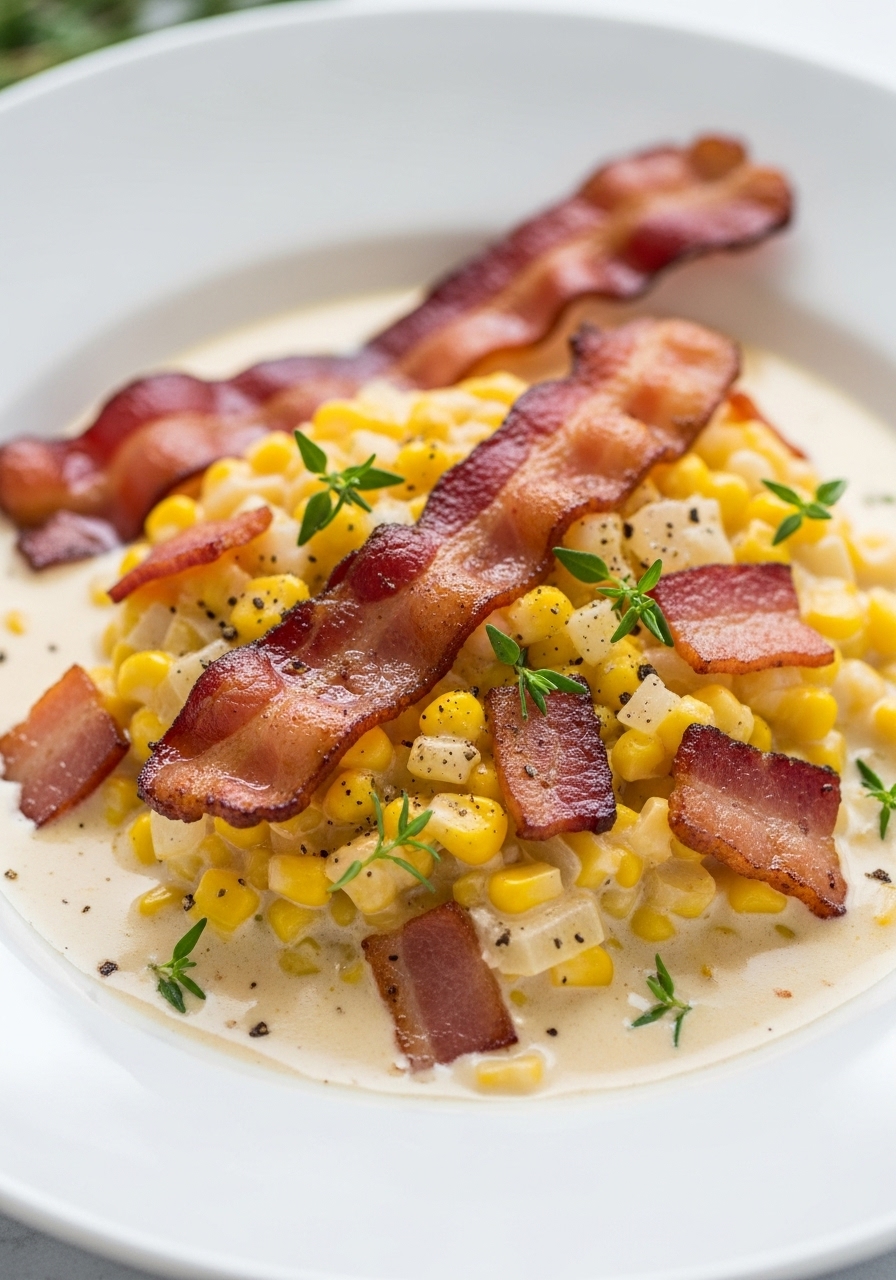 Stir in the remaining frozen corn, milk, and cheese. Mix everything together and let it simmer for 3 minutes, or until the cheese has melted and the soup is heated through. Taste and adjust the salt as needed. Serve the chowder garnished with the reserved bacon pieces.