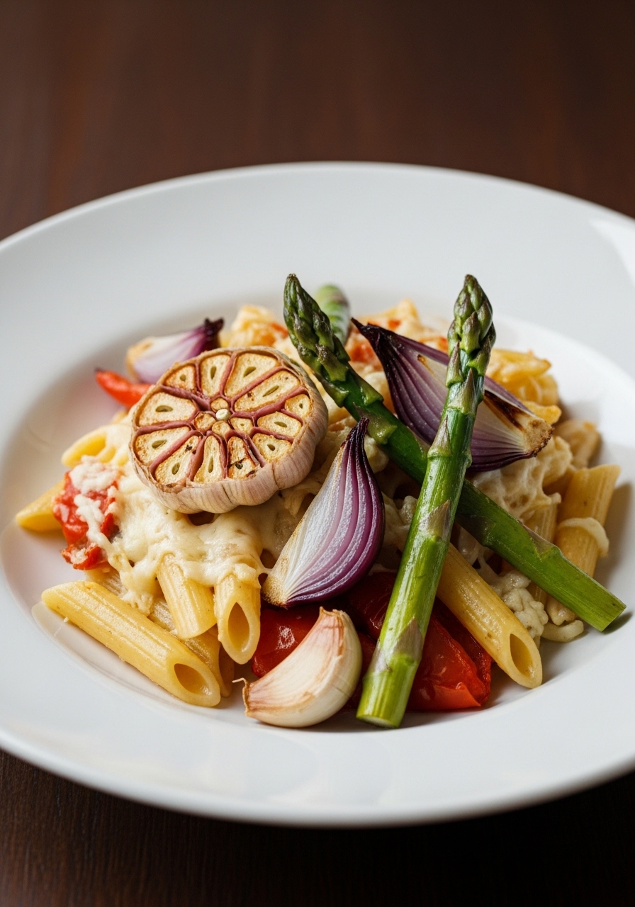 Indulge in a delightful penne pasta dish, generously layered with gooey cheese and a rich sauce, all while being packed with nutritious vegetables in every mouthful. Zucchini, vibrant red bell peppers, asparagus, red onion, and fennel are combined with balsamic vinegar and aromatic herbs before being roasted to perfection, creating a mouthwatering meatless baked pasta that’s truly unforgettable! Recipe title: "Cheesy Baked Penne with Roasted Veggies"