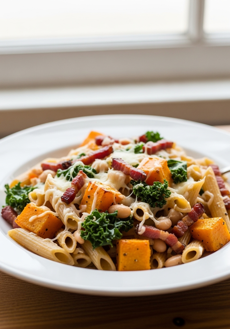 Indulge in this Cheesy Baked Pumpkin Pasta, featuring savory pancetta, vibrant kale, and hearty white beans, all crowned with a delightful blend of gruyere cheese and crispy panko breadcrumbs.