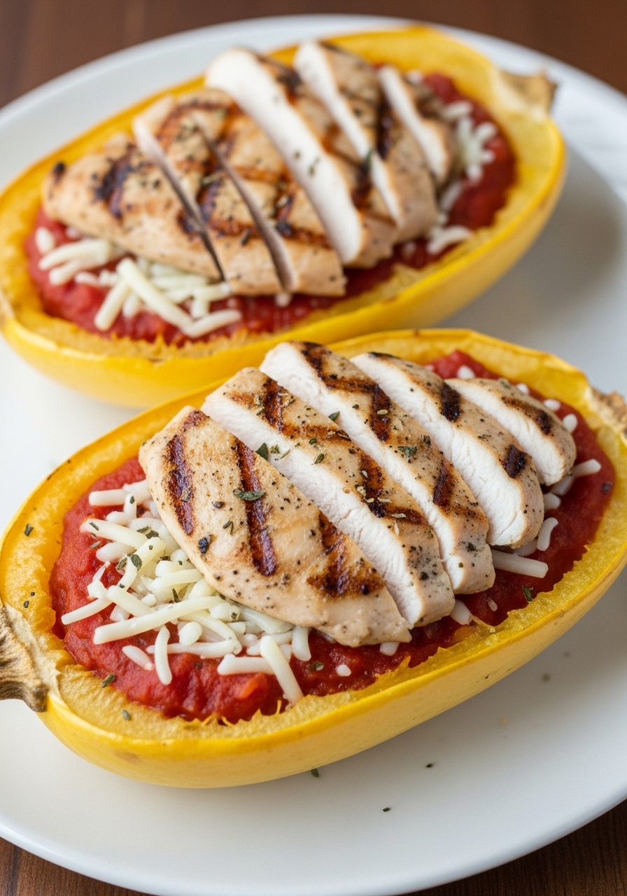 Cut the grilled chicken diagonally and place the slices atop each squash half. Spoon 1/4 cup of the remaining marinara sauce over the chicken, followed by a generous sprinkle of cheese. Return the squash boats to the oven and bake until the cheese is bubbly and melted, approximately 12 minutes.