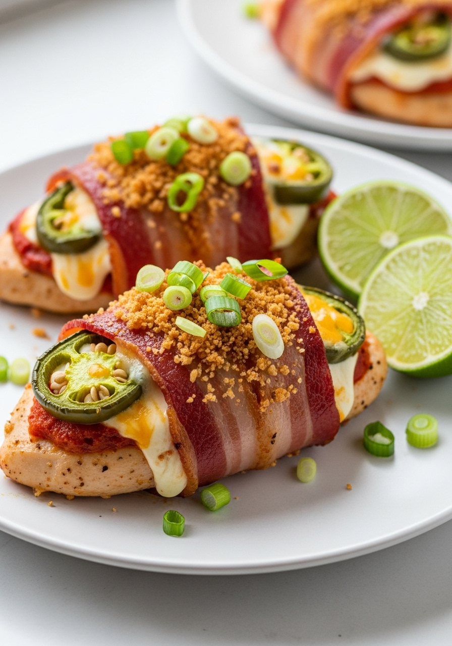 Indulge in this mouthwatering baked chicken breast filled with a delightful mixture of chopped jalapeños, creamy cheese, tangy cheddar jack, fresh scallions, and crispy bacon!