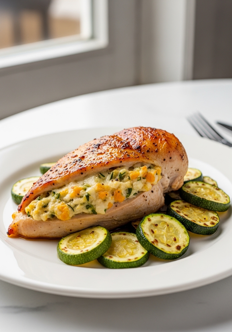 Indulge in these delectable Cheesy Stuffed Chicken Breasts, featuring a delightful blend of zucchini, sharp cheddar, and creamy cheese. This dish is not only mouthwatering but also an excellent choice for a protein-packed dinner option.