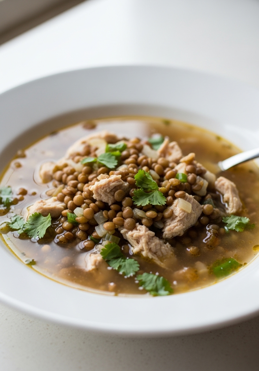 Experience the comforting embrace of this flavorful chicken and lentil soup, infused with the vibrant notes of cilantro, cumin, and an array of spices. It's an ideal dish to cozy up with on chilly winter evenings. Plus, its straightforward preparation, budget-friendly ingredients, and fulfilling nature make it a go-to recipe for any occasion.