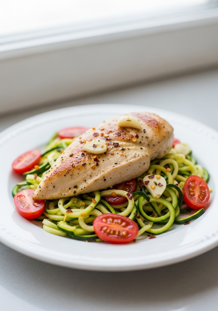 "Chicken and Zucchini Noodle Caprese features tender pieces of sautéed chicken breast paired with juicy grape tomatoes, all tossed together with spiralized zucchini, creamy fresh mozzarella, and fragrant basil. This delightful dish comes together in just 30 minutes, making it a simple, low-carb option for any meal!"
