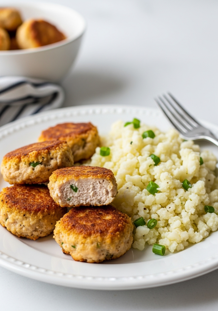 In a spacious mixing bowl, blend the ground chicken with cauliflower rice, salt, onion powder, garlic powder, and black pepper until thoroughly combined. Shape the mixture into approximately 30 round, flattened nuggets, each weighing around 25 grams.