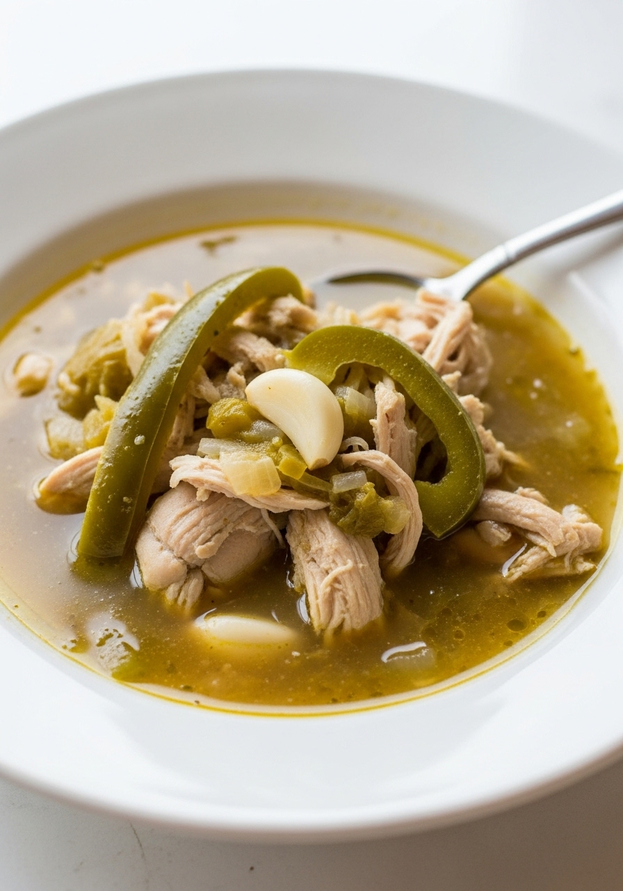 Indulge in a comforting bowl of Chicken Pozole Verde, a robust soup featuring tender shredded chicken, zesty roasted tomatillos, fresh cilantro, and a kick of chiles. Customize it with your preferred garnishes for a delightful finish!