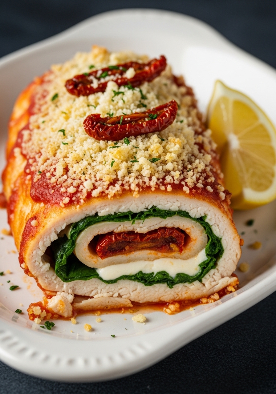 Indulge in these Chicken Rollatini, where succulent chicken breasts are generously stuffed with a delightful mixture of sun-dried tomato bruschetta, creamy mozzarella, and fresh spinach. Each piece is rolled up, coated in breadcrumbs, and then baked to perfection in either the oven or an air fryer for a crispy finish.