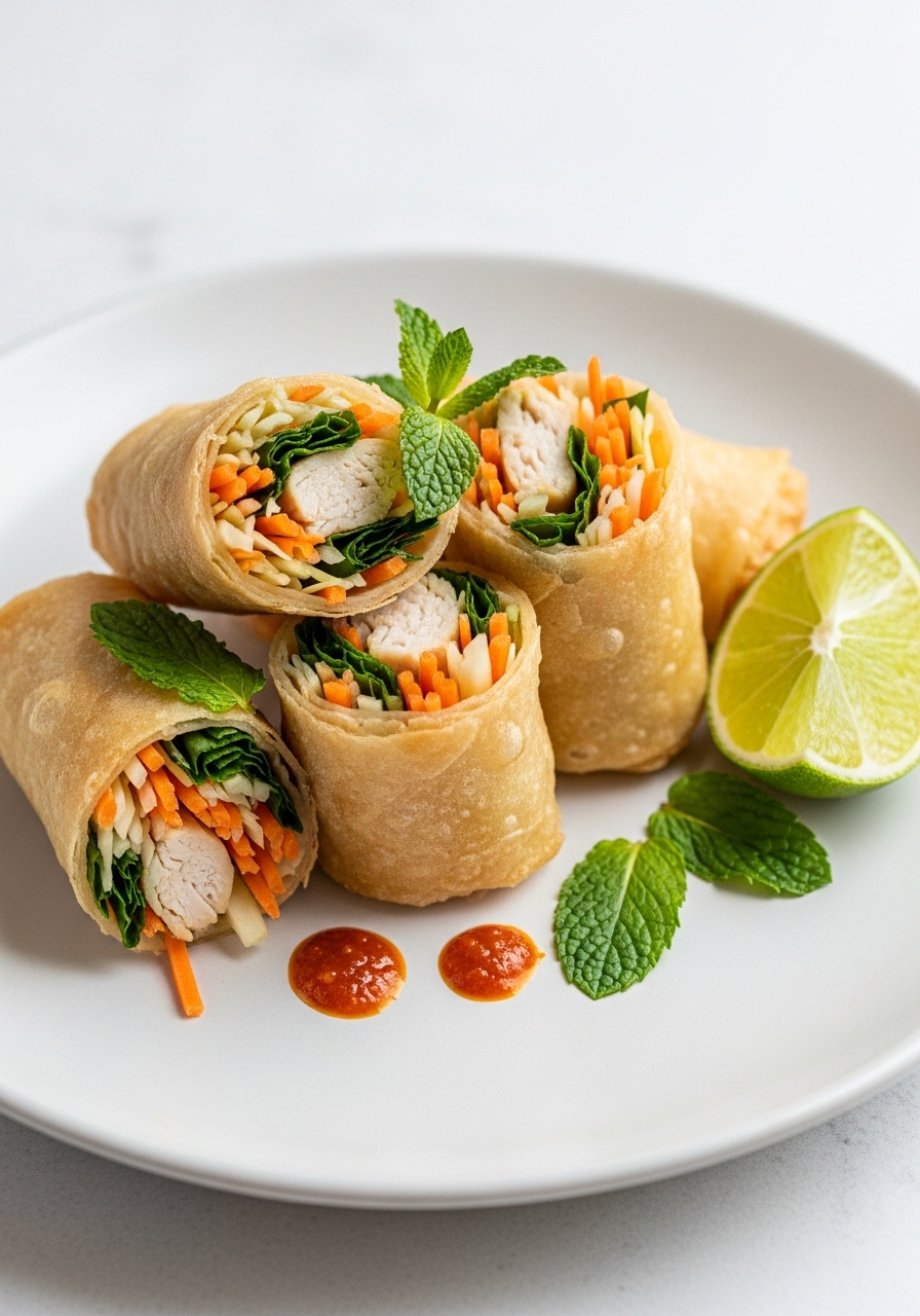 "These vibrant summer rolls filled with ground chicken and served with hoisin sauce offer a refreshing and airy bite, showcasing a delightful mix of textures and flavors."