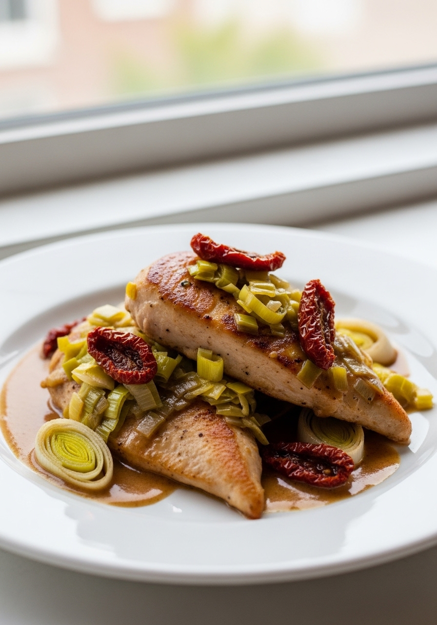 Place the sun-dried tomato and leek mixture on top of the chicken and serve immediately.