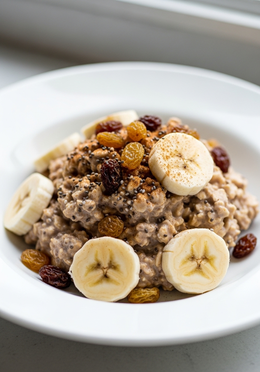 Garnish with banana slices, walnuts, and, if you like, some additional raisins or berries before digging in.