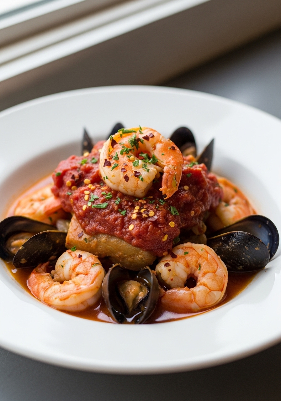 Cioppino is a delectable seafood stew that hails from San Francisco, featuring an assortment of shellfish and fish gently cooked in a hearty broth infused with tomatoes and wine.