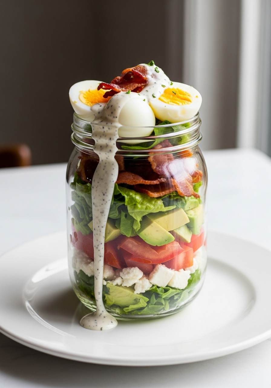 "Enjoy a delightful mix of chicken, tomatoes, crispy bacon, creamy avocado, hard-boiled eggs, tangy blue cheese, and fresh lettuce, all beautifully arranged in a jar. Drizzled with a light homemade buttermilk ranch dressing, this portable meal is ideal for prepping in advance. Whether heading to the office, school, the beach, or a picnic, you'll have a tasty and satisfying dish ready to enjoy wherever you are!"