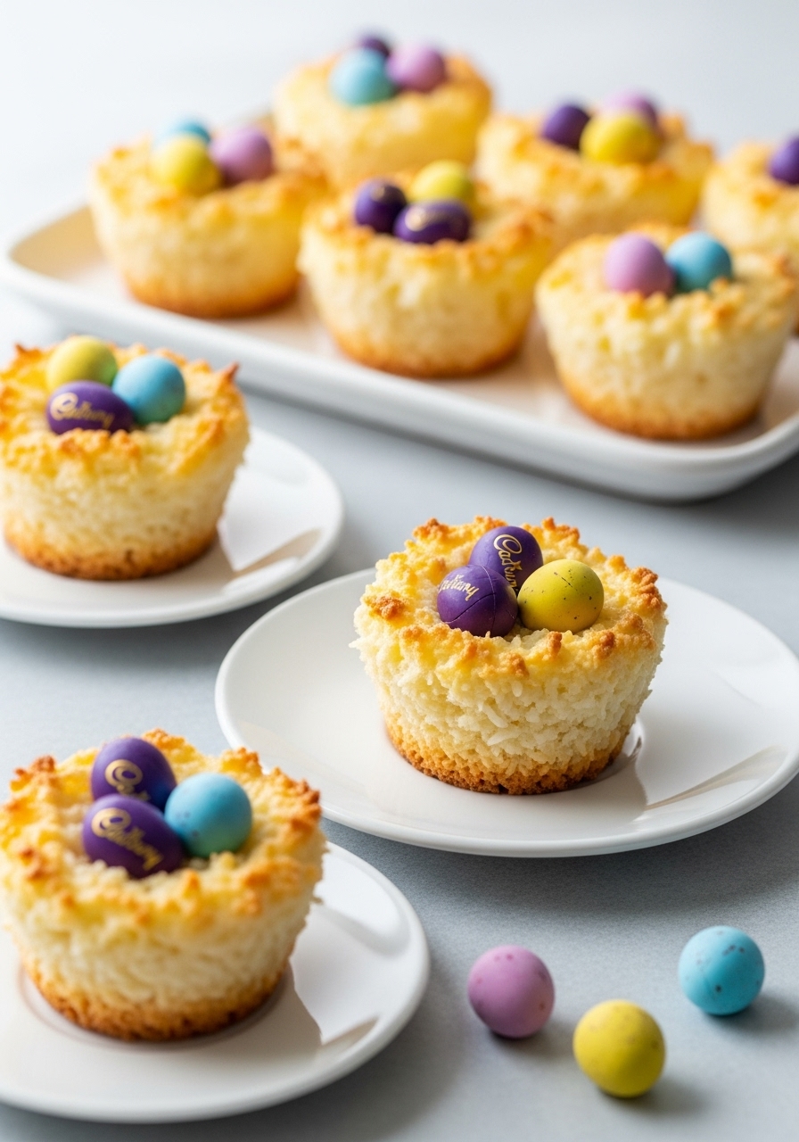 Simple gluten-free coconut macaroons crafted into delightful bird's nests, each one brimming with mini Cadbury chocolate eggs – a delightful treat perfect for Easter!