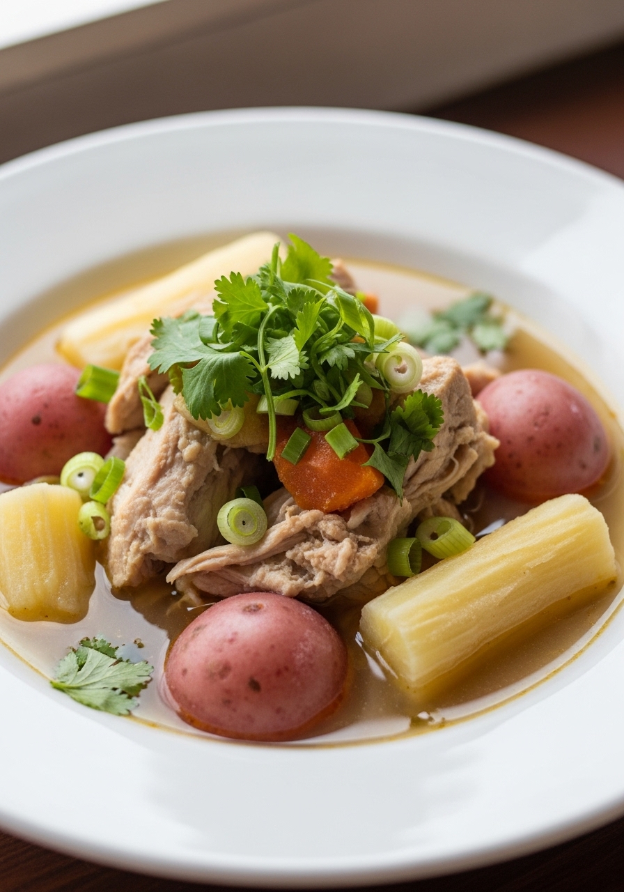 "Colombian Chicken Sancocho is a comforting and robust soup that resembles a stew, deeply rooted in the culinary traditions of the Antioquia region in Colombia. This delightful dish features a medley of ingredients including potatoes, yuca, corn, plantains, and tender chicken."