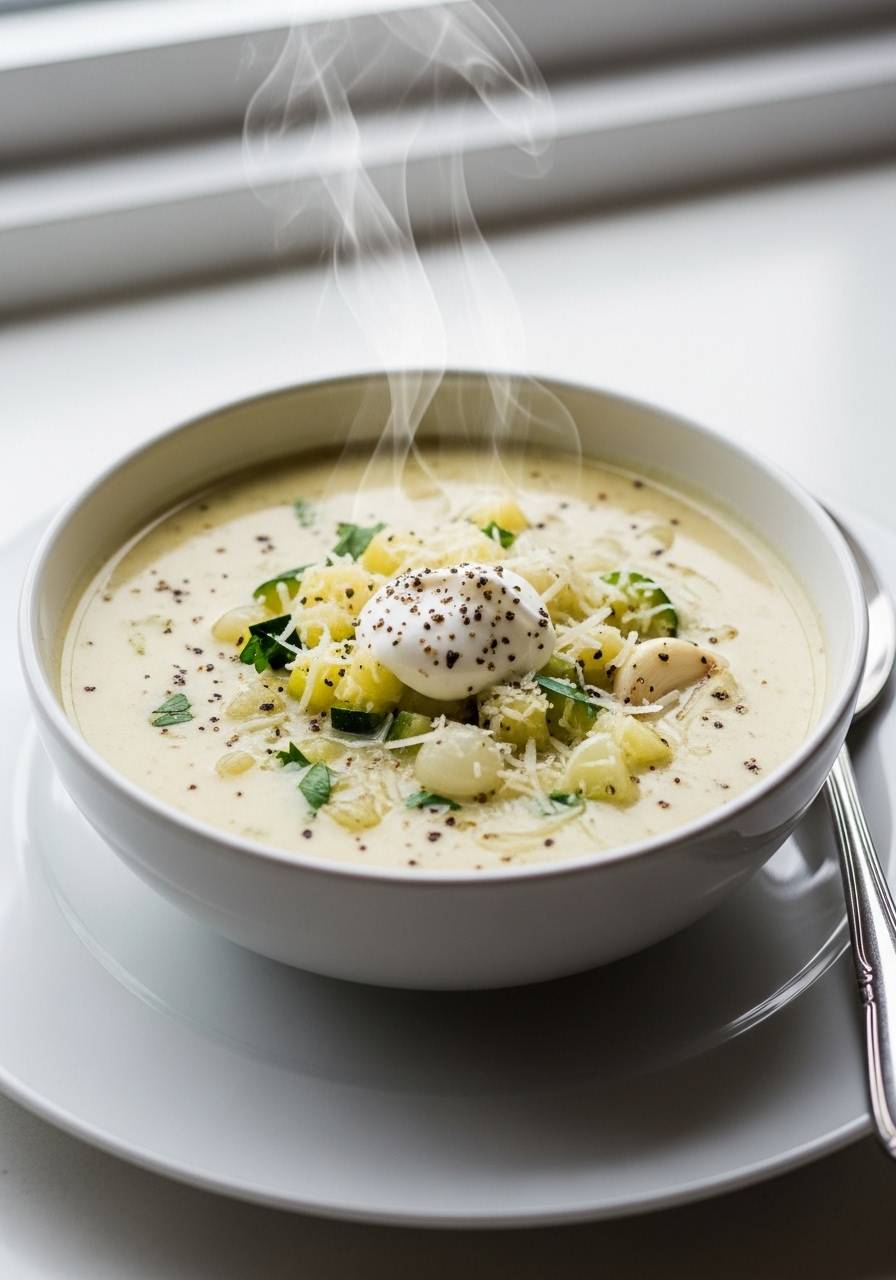 "With just FIVE simple ingredients (excluding salt and pepper), you can whip up this quick and delightful cream of zucchini soup that my family has cherished for years!"
