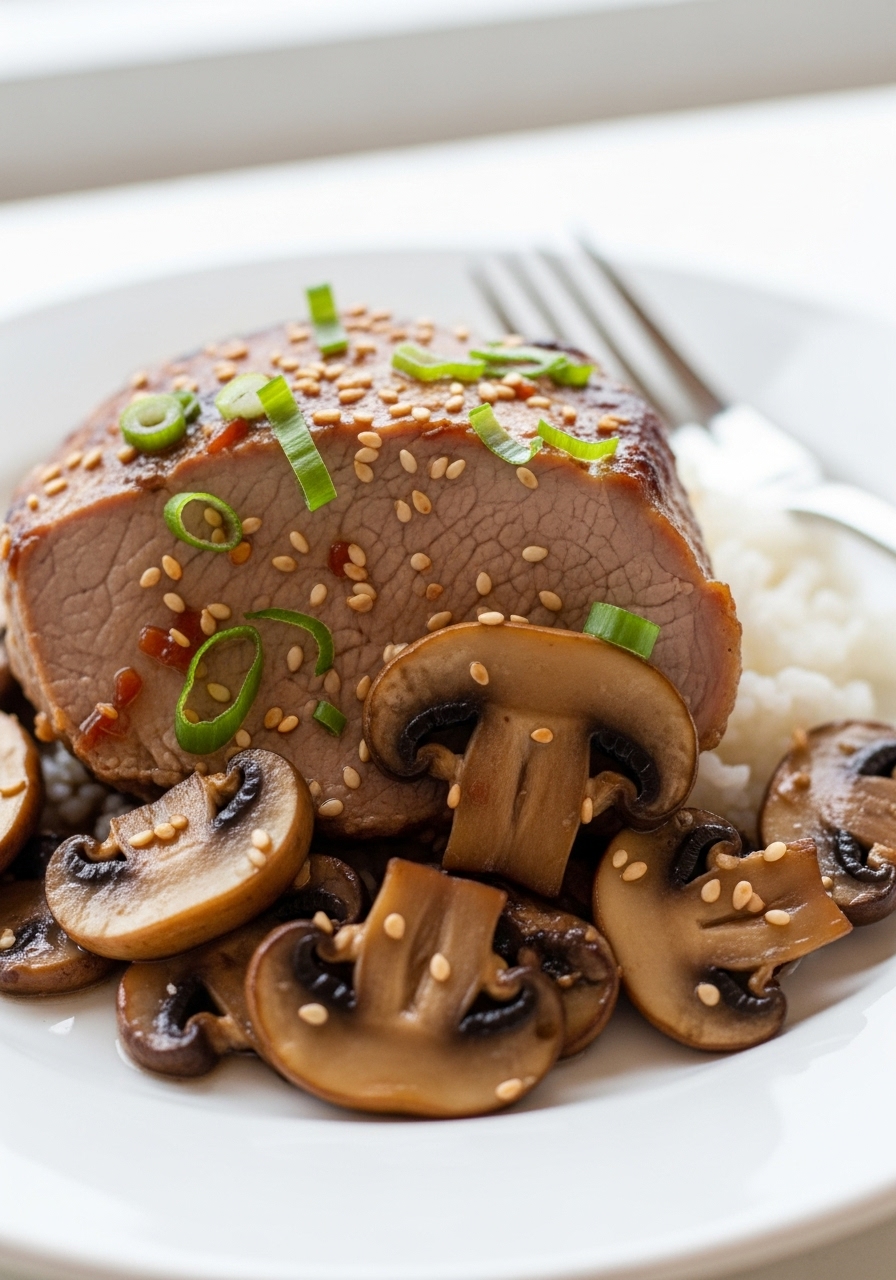 Succulent boneless pork roast is gently simmered with a blend of Asian spices, resulting in a fragrant and flavorful dish enriched with mushrooms and savory broth. This delightful pork can be served over a bed of rice or noodles, garnished with freshly chopped green onions, cilantro, and a drizzle of sriracha for an extra kick.