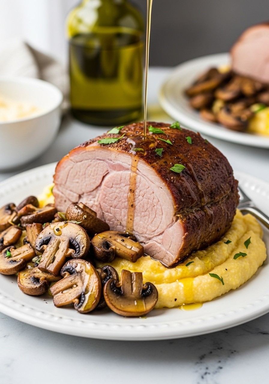 To serve, place ½ cup of polenta on each plate, then top with the pork and mushrooms, finishing with a sprinkle of parsley for garnish.