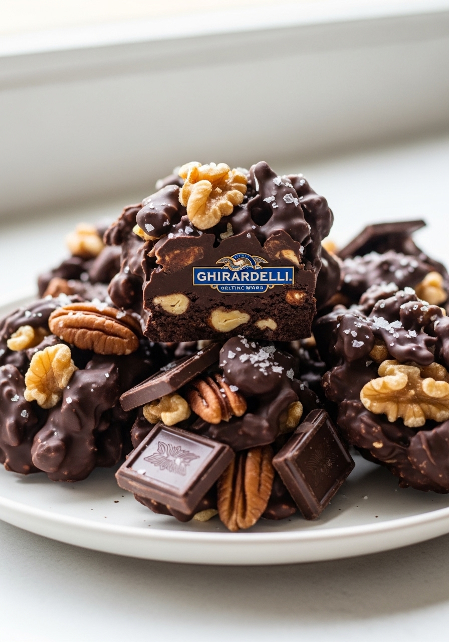 "Experience the delightful combination of almonds, pecans, and walnuts enveloped in rich, melted dark chocolate, all topped off with a sprinkle of sea salt for the ultimate festive indulgence!"