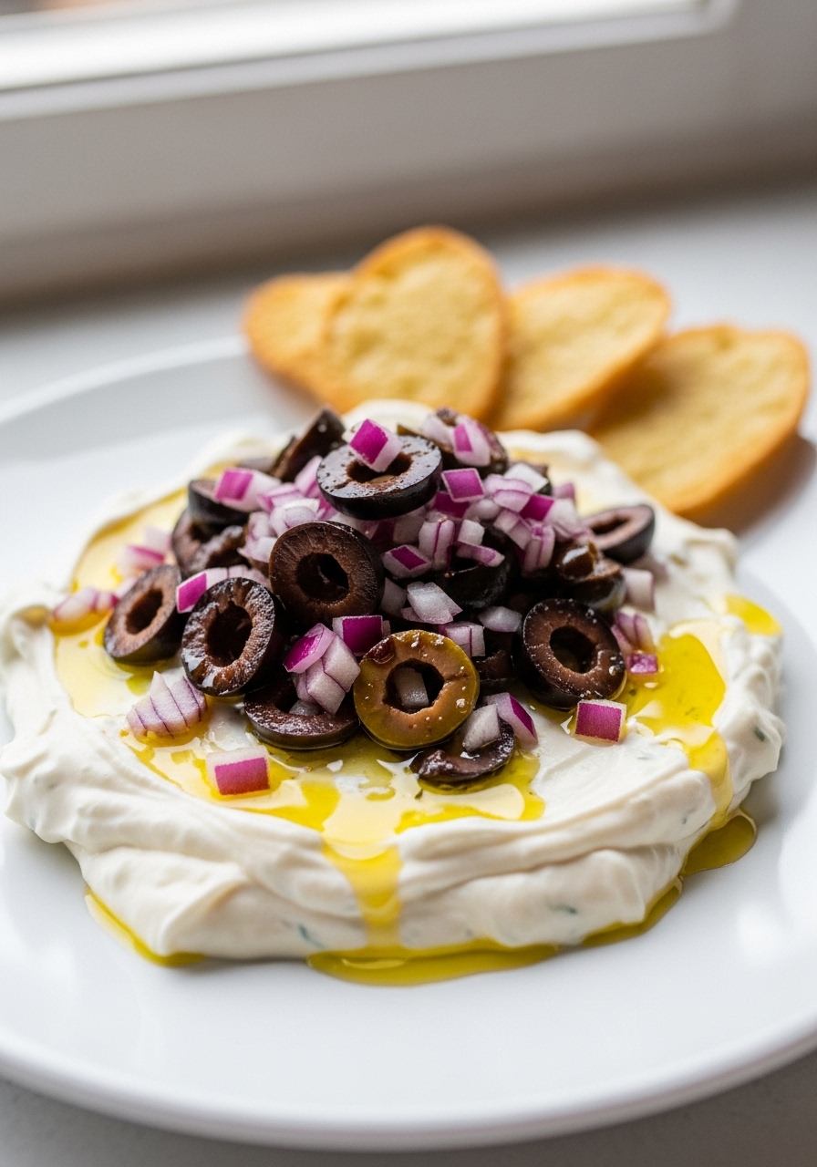 Transfer the dip into a serving dish and garnish with lemon zest and extra olives on top.