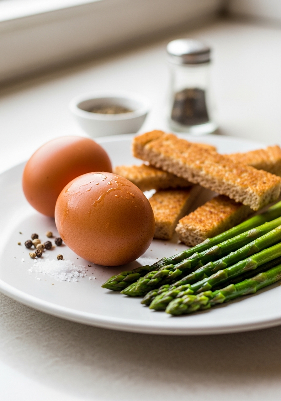 Golden strips of whole grain toast, affectionately known as "soldiers," paired with vibrant, lightly cooked asparagus and a luscious soft-boiled egg for dipping—this delightful combination embodies the essence of a perfect Spring breakfast!